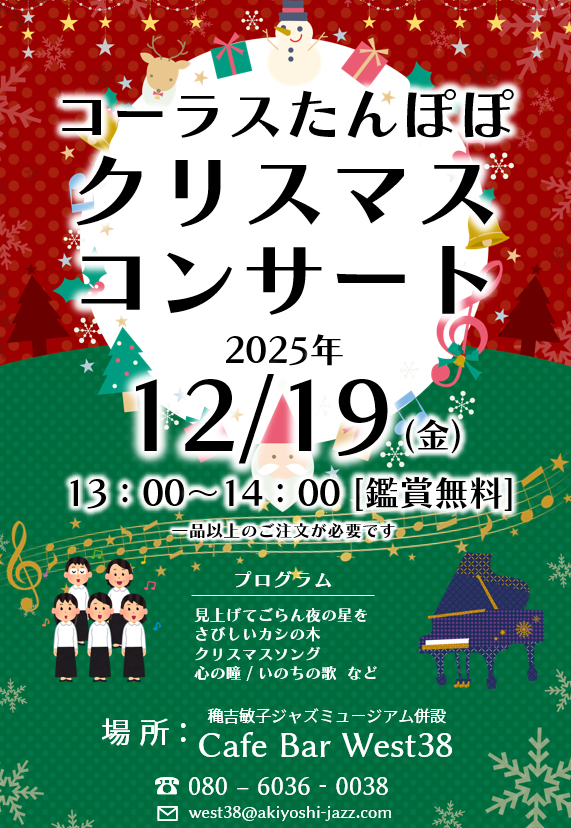 【12/19(金)13時~】コーラスたんぽぽ 投稿者:Yui Kitada 投稿公開日:2025年12月11日 投稿カテゴリー:イベント コーラスたんぽぽ 総勢約20名のクリスマスコーラスコンサート! ※鑑賞無料※一品以上のご注文が必要です ▼ イベント情報カレンダーはこちらhttps://akiyoshi-jazz.com/event/ その他の記事を読む 前の投稿【12/14(日)13時~】Joe Li&北田了一Duo 次の投稿【12/19(金)13時~】Victorian5~クリスマスライブ~ おすすめ 【1/17(土)19時~】八重樫京介トリオ 2026年1月10日 【12/17(日)13時~】Joe Li &八重樫京介 2023年12月10日 【4/3(月)19時~ライブ】Toy-Box ~ 心の日曜日コンサート♪ 2023年3月27日