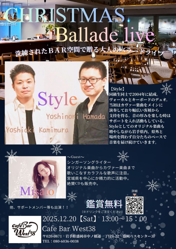 【12/20(土)13時~】Style ~Xmas Ballade Live~ 投稿者:Yui Kitada 投稿公開日:2025年12月13日 投稿カテゴリー:イベント Style ~Xmas Ballade Live~style・上村嘉聴・濱田好典・長野剛・菊地英樹・高橋欣宏・Misato・橋場※鑑賞無料※一品以上のご注文が必要です ▼ イベント情報カレンダーはこちらhttps://akiyoshi-jazz.com/event/ その他の記事を読む 前の投稿【12/19(金)13時~】Victorian5~クリスマスライブ~ 次の投稿【12/20(土)19時~】宮澤賢治 朗誦伴奏 102年後の出版祝賀会 おすすめ 【11/30(土)19時~】Mari’s Night 2024年11月22日 予約受付中のイベント一覧 2023年11月28日 【7/11(木)18時半~】monakaオープン祝セッション 2024年7月4日