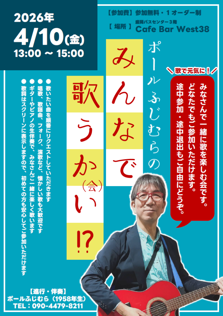 【4/10(金)13時~】ポールふじむらの歌うかい(会)!? 投稿者:Yui Kitada 投稿公開日:2026年4月3日 投稿カテゴリー:イベント ポールふじむら(進行・伴奏)※鑑賞無料※一品以上のご注文が必要です ▼ イベント情報カレンダーはこちらhttps://akiyoshi-jazz.com/event/ その他の記事を読む 前の投稿【4/5(日)13時~】うーの☆とりあ おすすめ 【1/19(日)13時~】Joe Li & トシ山崎 & The Friends 2025年1月12日 【11/22(土)19時~】Mari’s Night 2025年11月15日 【5/3(祝)15時~】秀ちゃんバンド 2023年4月30日