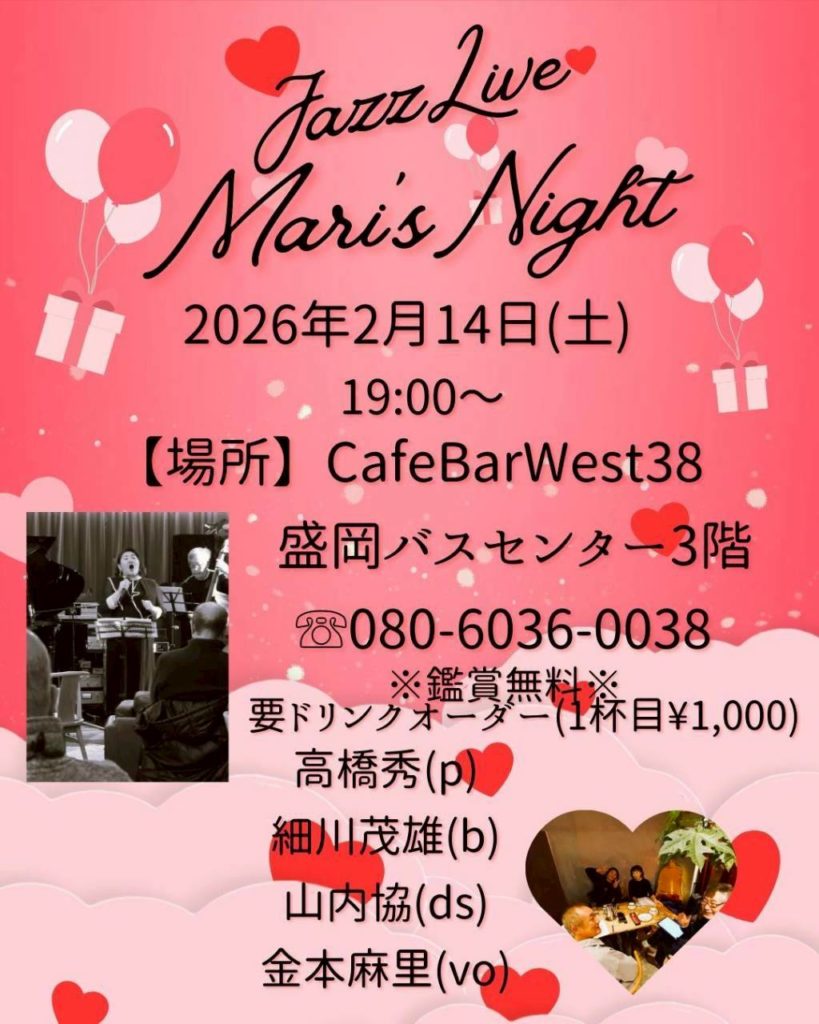 【2/14(土)19時~】Mari’s Night 投稿者:Yui Kitada 投稿公開日:2026年2月7日 投稿カテゴリー:イベント Mari’s Night金本麻里(Vo)高橋秀(Pf)細川茂雄(Ba)山内協(Dr)※鑑賞無料※1ドリンク(1杯目一律1,000円)以上をご注文ください ▼ イベント情報カレンダーはこちらhttps://akiyoshi-jazz.com/event/ その他の記事を読む 前の投稿2026年2月のイベントカレンダー おすすめ 【3/17(日)18時半~】橘和徳×絵美夏 ツーマンライブ「THE DUO」 2024年3月10日 【4/6(土)19時~】うーの☆とりあ 2024年3月30日 【12/25(木)18時~】West38クリスマスセッション 2025年12月17日