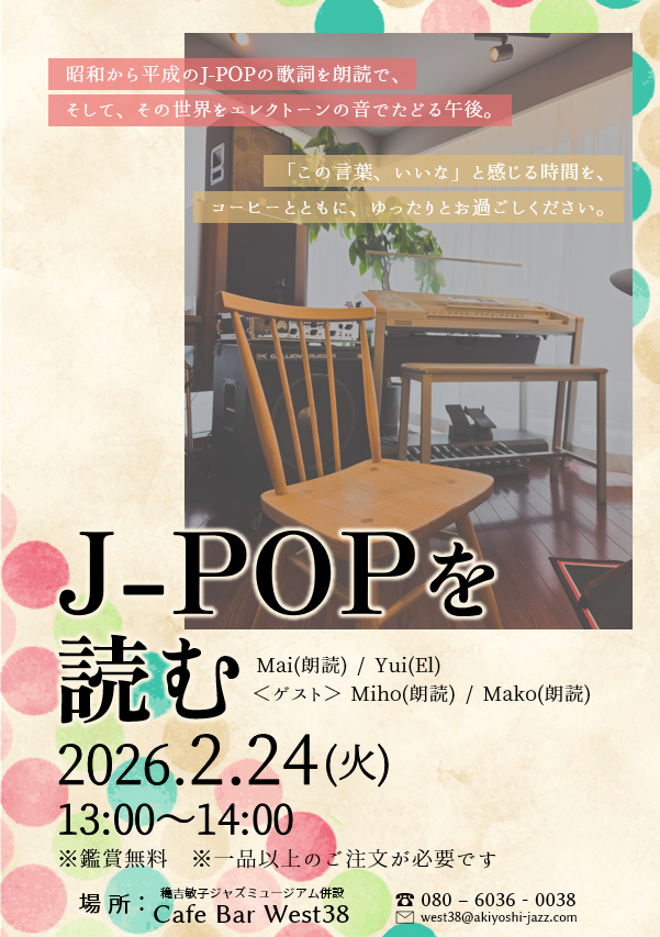 【2/24(火)13時~】J-POPを読む ― 歌詞朗読×エレクトーン ― 投稿者:Yui Kitada 投稿公開日:2026年2月17日 投稿カテゴリー:イベント J-POPを読む ― 歌詞朗読×エレクトーン ―Mai(朗読)Yui(El)<ゲスト>Miho(朗読)Mako(朗読)※鑑賞無料※一品以上のご注文が必要です ▼ イベント情報カレンダーはこちらhttps://akiyoshi-jazz.com/event/ その他の記事を読む 前の投稿【2/21(土)19時~】八重樫京介トリオ おすすめ 【2/15(土)19時~】Mari’s Night 2025年2月8日 【2/22(土)13時~】三野玉澤DUO 2025年2月15日 【11/2(土)13時~】Yasuko meets Daryl Sherman 2024年10月27日