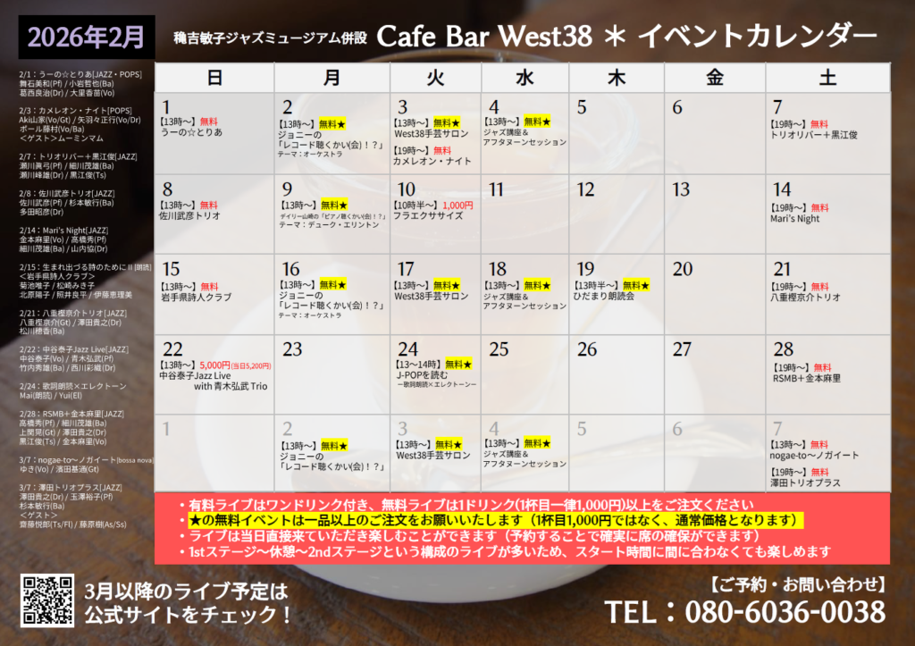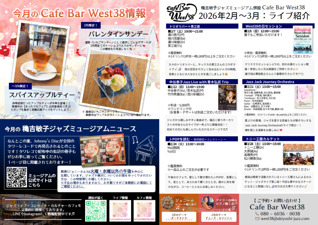 2026年2月のイベントカレンダー 投稿者:Yui Kitada 投稿公開日:2026年2月5日 投稿カテゴリー:West38 こんにちは!スタッフの北田です!(^^)!遅くなりましたが、2月のイベントカレンダーはこちらです✨チラシは店頭にてご自由にお持ち帰りくださいね🎶▼PDFのダウンロードはこちら!202602_ライブカレンダーチラシ その他の記事を読む 前の投稿3/7(土) 12:00 から販売開始!【6/6(土)18時30分~】徳永暁人 8弦ベース弾き語りツアー「With your claps」 おすすめ 【West38】4月の月替わりコーヒー♪ 2024年4月3日 Johnny’s is the Master’s Shop!? Morioka may be a hot destination in 2023! 2023年1月14日 【West38】いよいよジャズフェス♪ 2025年6月18日