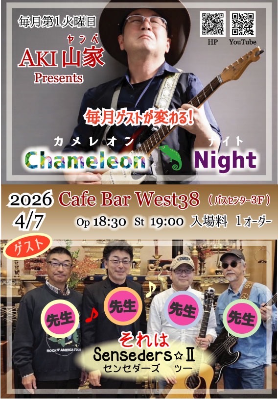 【4/7(火)19時~】Aki山家 presents カメレオン・ナイト 投稿者:Yui Kitada 投稿公開日:2026年3月24日 投稿カテゴリー:イベント Aki山家 presents カメレオン・ナイトAki山家(Vo/Gt)矢羽々正行(Vo/Dr)ポール藤村(Vo/Ba)<ゲスト>SENSEDERS✩Ⅱ※鑑賞無料※1ドリンク(1杯目一律1,000円)以上をご注文ください▼Aki山家公式サイトhttps://www.akihiroyambe.com/ ▼ イベント情報カレンダーはこちらhttps://akiyoshi-jazz.com/event/ その他の記事を読む 前の投稿【3/29(日)13時~】生まれ出づる詩のために おすすめ 【10/26(日)13時~】松原慶史 with 八重樫京介トリオ 2025年10月18日 【8/24(日)13時~】THE SAMA GeeS 武田チャッピー治,太田惠資,石澤由松 2025年8月16日 【11/15(土)19時~】八重樫京介トリオ 2025年11月8日