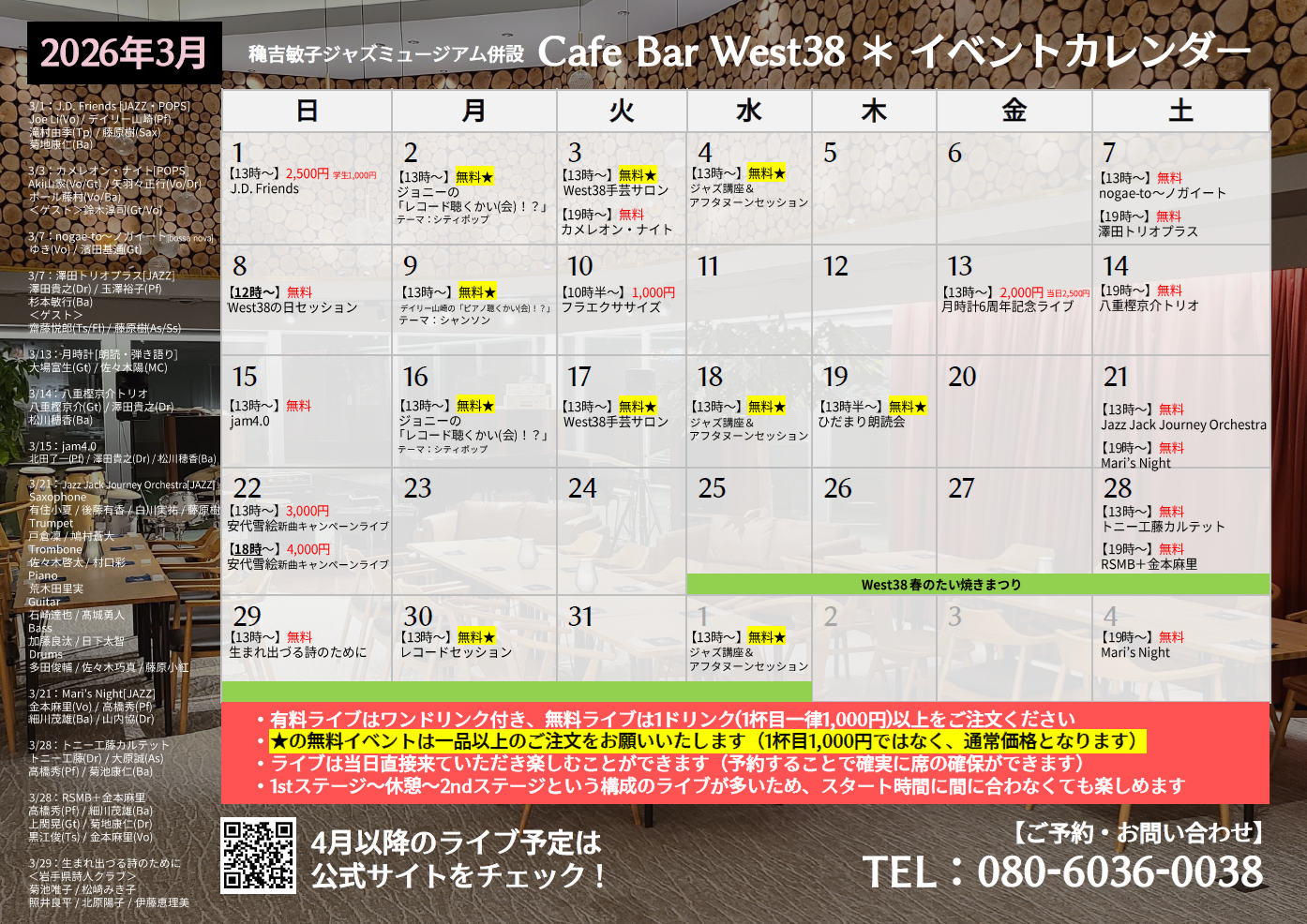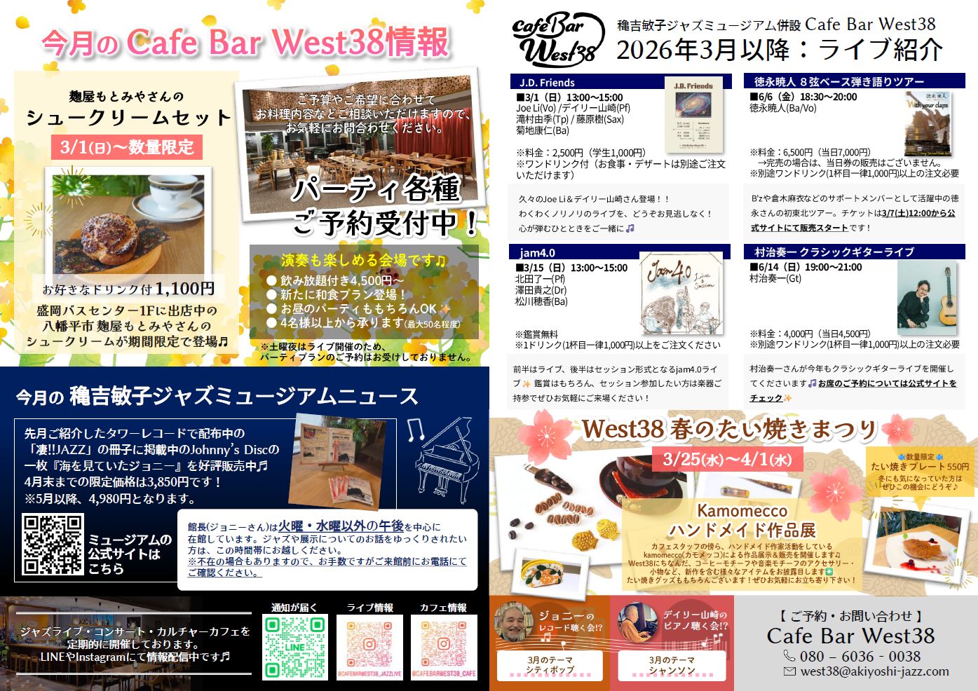 2026年3月のイベントカレンダー 投稿者:Yui Kitada 投稿公開日:2026年3月1日 投稿カテゴリー:West38 こんにちは!スタッフの北田です!(^^)!遅くなりましたが、3月のイベントカレンダーはこちらです✨チラシは店頭にてご自由にお持ち帰りくださいね🎶 ▼PDFのダウンロードはこちら!202603_ライブカレンダーチラシ その他の記事を読む 前の投稿【3/7(土)19時~】澤田トリオプラス おすすめ 【West38】(数量限定!!)スペシャルジントニックはじまります 2023年11月18日 【West38】CDとオーディオ 2023年10月25日 【West38】1/1~営業時間変更のお知らせ 2023年12月18日