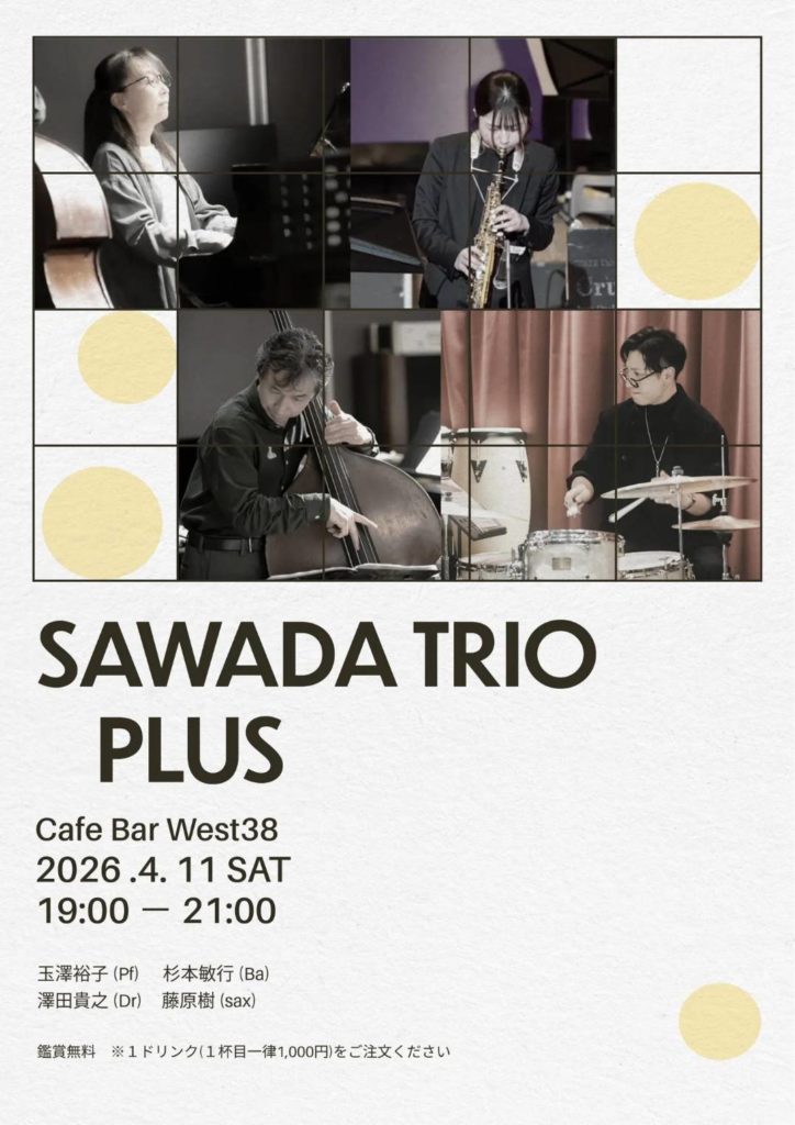 【4/11(土)19時~】澤田トリオプラス 投稿者:Yui Kitada 投稿公開日:2026年4月4日 投稿カテゴリー:イベント 澤田トリオプラス澤田貴之(Dr)玉澤裕子(Pf)杉本敏行(Ba)<ゲスト>藤原樹(As/Ss)※鑑賞無料※1ドリンク(一律1,000円)以上をご注文ください ▼ イベント情報カレンダーはこちらhttps://akiyoshi-jazz.com/event/ その他の記事を読む 前の投稿【4/10(金)13時~】ポールふじむらの歌うかい(会)!? おすすめ 【7/6(日)13時~】鈴木淳司バンド ~APPLAUSE発売2周年記念ライブ 2025年6月28日 【3/2(土)19時~】トリオリバー 2024年2月23日 【8/31(土)19時~】RSMB 2024年8月24日
