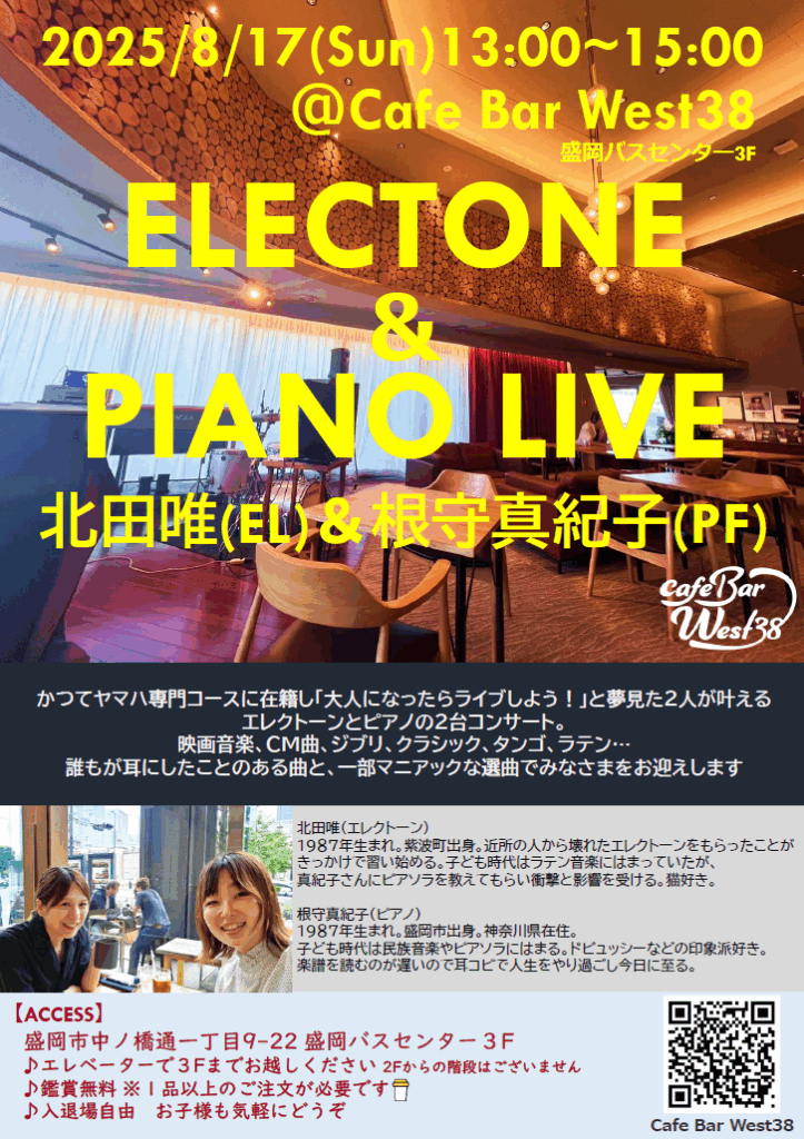 【8/17(日)13時~】ELECTONE&PIANO LIVE 投稿者:Yui Kitada 投稿公開日:2025年8月10日 投稿カテゴリー:イベント ELECTONE&PIANO LIVE根守真紀子(Pf)北田唯(El)※鑑賞無料※一品以上のご注文が必要です ▼ イベント情報カレンダーはこちらhttps://akiyoshi-jazz.com/event/ その他の記事を読む 前の投稿【8/16(土)19時~】八重樫玉澤DUO 次の投稿【8/23(土)13時30分~】ぺったん文庫手作り本お披露目会 おすすめ 【5/8(木)19時~】岩山 夜明けの音楽会 2025年5月1日 【11/1(土)19時~】佐藤公治カルテット 2025年10月25日 【11/9(土)13時~】気仙沼フェニックスハワイアン 2024年11月1日