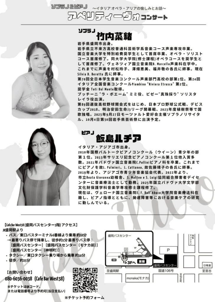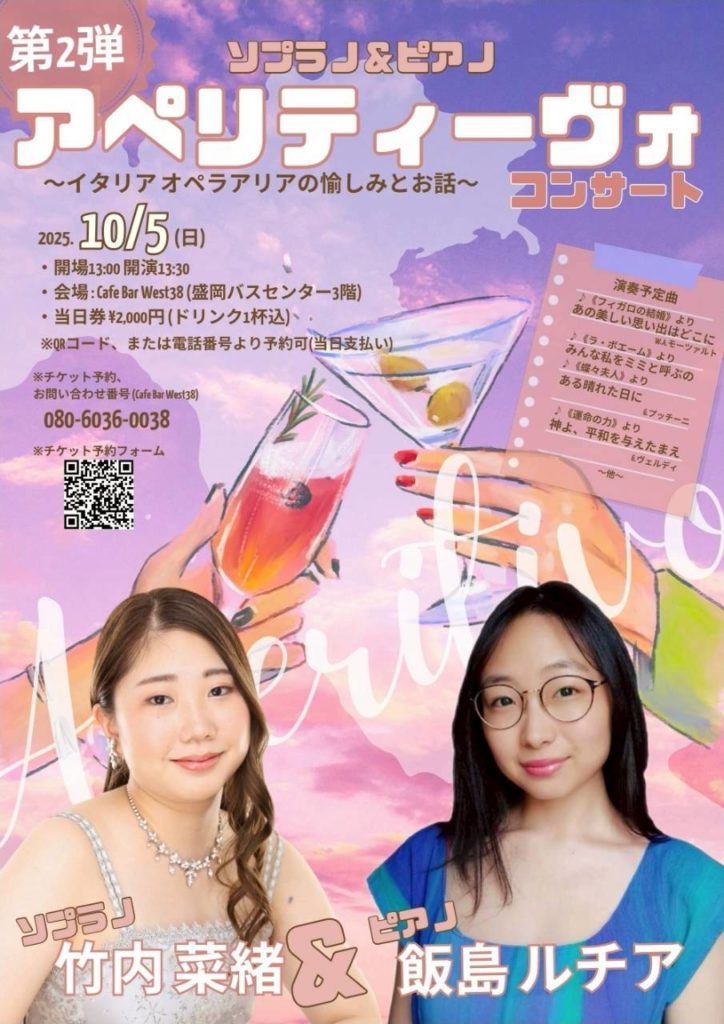 【10/5(日)13時30分~】第2弾アペリティーヴォ・コンサート ~イタリア オペラ・アリアの愉しみとお話~ 投稿者:Yui Kitada 投稿公開日:2025年9月29日 投稿カテゴリー:イベント 第2弾アペリティーヴォ・コンサート ~イタリア オペラ・アリアの愉しみとお話~竹内菜緒(Sop)飯島ルチア(Pf)※料金:2,000円※ワンドリンク付(お食事・デザートは別途ご注文いただけます)▼ご予約はこちらhttps://forms.gle/mwyjakmP1f4BRcGE7 ▼ イベント情報カレンダーはこちらhttps://akiyoshi-jazz.com/event/ その他の記事を読む 前の投稿【10/4(土)19時~】澤田トリオプラス 次の投稿【10/7(火)19時~】Aki山家 presents カメレオン・ナイト おすすめ 【12/10(日)13時~】齊藤さっこ&ずれずれ2 2023年12月3日 【2/1~14】バレンタインフェア開催! 2023年2月1日 【4/27(土)19時~】澤田トリオ 2024年4月20日
