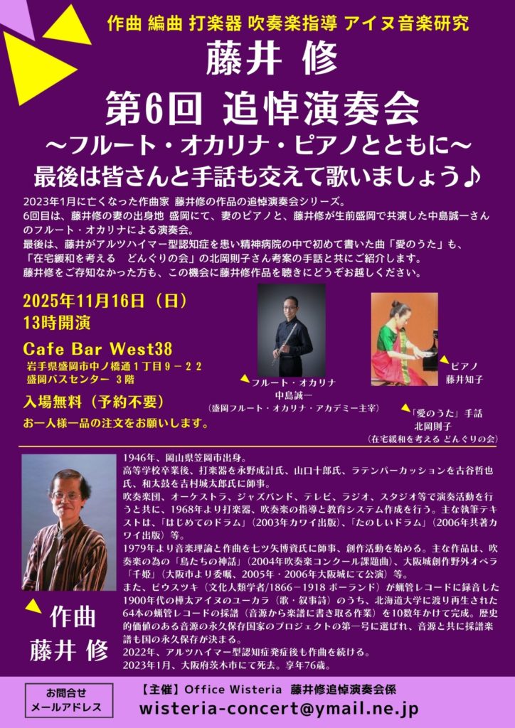 【11/16(日)13時~】第6回 藤井修追悼演奏会~ピアノ・フルート・オカリナとともに~ 投稿者:Yui Kitada 投稿公開日:2025年11月8日 投稿カテゴリー:イベント **************最後はみなさんと手話も交えて歌いましょう♪2023年1月に亡くなった作曲家 藤井修の作品の追悼演奏会シリーズ。6回目は、藤井修の妻の出身地 盛岡にて、妻のピアノと、藤井修が生前盛岡で共演した中島誠一さんのフルート・オカリナによる演奏会。最後は、藤井がアルツハイマー型認知症を患い精神病院の中で初めて書いた曲「愛のうた」も、「在宅緩和を考える どんぐりの会」の北岡則子さん考案の手話と共にご紹介します。藤井修をご存知なかった方も、この機会に藤井修作品を聴きにどうぞお越しください。************** 第6回 藤井修追悼演奏会~ピアノ・フルート・オカリナとともに~中島誠一(フルート・オカリナ)藤井知子(ピアノ)北岡則子(「愛のうた」手話)※鑑賞無料※一品以上のご注文が必要です▼公式サイトはこちらhttps://samwisteria.wixsite.com/fujii ▼ イベント情報カレンダーはこちらhttps://akiyoshi-jazz.com/event/ その他の記事を読む 前の投稿【11/15(土)13時~】nogae-to〜ノガイート〜 次の投稿【11/22(土)19時~】Mari’s Night おすすめ 【9/28(日)13時~】佐川トリオ 2025年9月21日 【11/2(日)13時~】うーの☆とりあ 2025年10月26日 【3/29(土)19時~】RSMB 2025年3月22日