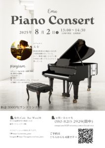 【ライブ】えむピアノコンサート イベント詳細 日付: 2025年8月2日 1:00 PM – 3:00 PM えむ(Pf) ※料金:3,000円 ※ワンドリンク付(お食事・デザートは別途ご注文いただけます) ▼ご予約はこちら https://forms.gle/J7DQosioUcgHj4Kd6