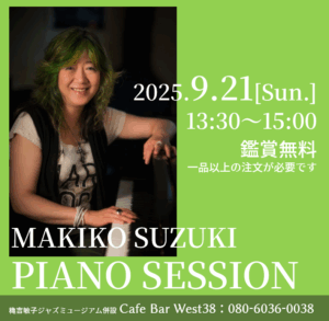 【ライブ】MAKIKO SUZUKI PIANO SESSION イベント詳細 日付: 2025年9月21日 1:30 PM – 3:00 PM 鈴木牧子(Pf)他 ※鑑賞無料 ※一品以上のご注文が必要です